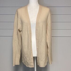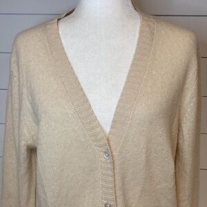 Size medium Reed Krakoff cashmere button front cardigan sweater. Creamy tan. Ribbed trim around cuffs, neckline and hem.
