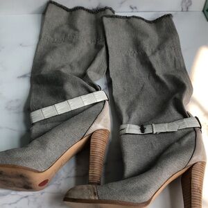 These are gorgeous linen boots from contemporary luxury designer Reed Krakoff. Beautiful and classy. Wear them over the knee or cuff them over for a shorter look (pictured in second picture).