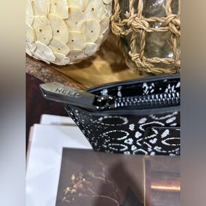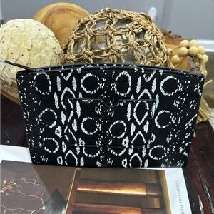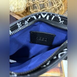 Cute black and white pouch by Reed. Made of faux leather. Beautiful blue lining inside. One cc slot on outside clean on inside and out. Very practical. You can fit your phone and a lot of other things. Measures about 8x5 inches. The pattern is super cute. Gently used.