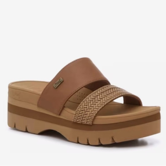 This platform pair is complete with a double strap design and a laidback slide silhouette.