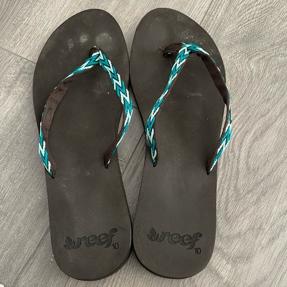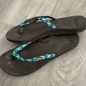 Reef Brown and Teal Flip Flops with Coral Accents size 10