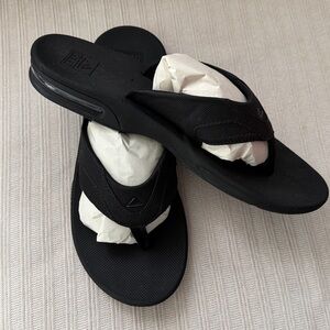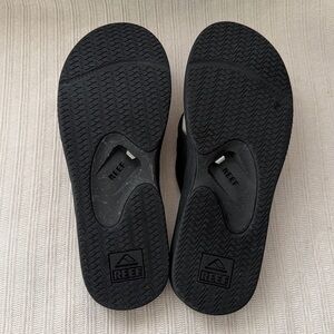 Comfortable black sandals by Reef. Ideal for everyday use. With a synthetic nubuck upper, padded liner, compression molded footbed with a heel airbag, plus herringbone rubber outsole with built-in bottle opener.
