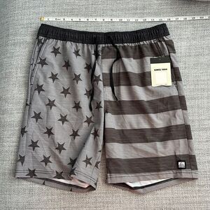 That's the spirit, with this epic stars-'n'-stripes pattern. These 18-inch outseam easy-care poly board shorts feature side pockets and a back pocket, and a super comfortable drawcord waist. Beach freely with these, friend.