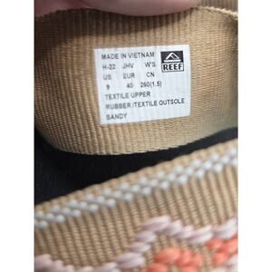 In excellent clean condition. Maybe never worn. The Reef Women's Sandy Flip-Flop in Black/Tan, Size 9, is a stylish and comfortable sandal perfect for casual and travel occasions. Featuring a geometric pattern with embroidered logo accents, this slip-on style sandal has a cushioned and lightweight design for ultimate comfort. The flat heel and standard shoe width provide all-day wearability, making it an ideal choice for the summer and spring seasons. With its durable synthetic upper material and quality brand, Reef, these sandals are a fashionable and practical addition to any woman's shoe collection.