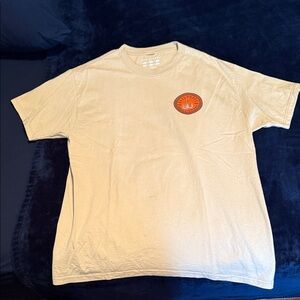 Stylish beige t-shirt featuring a unique salmon design. Perfect for casual outings. Size L