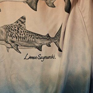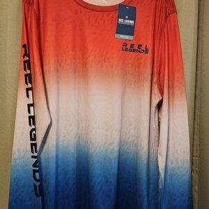 This Reel Legends Americana Long Sleeve Shirt features a shark print design. It features moisture-wicking/quick-dry technology and UPF 50 sun protection. The Reel Legend logo are printed on the chest and right arm.