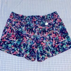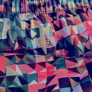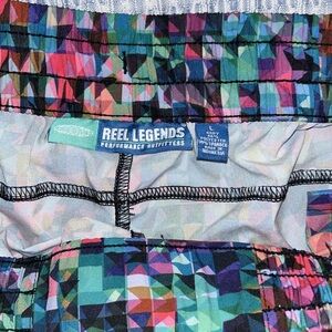 These are Reel Legends brand athletic shorts, featuring a colorful geometric pattern, a drawstring waist, and a reflective stripe on the side. They are made from moisture-wicking and quick-dry fabric with UPF 50 sun protection. The inseam is approximately 3 inches. They’re size L. Very lightweight!