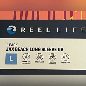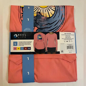 Brand new with tag, never worn or removed from packaging, Reel Life, Size Large, Jax Beach long sleeve UV Tee, Graphic on the back- Raised on the Water, crewneck, color is salmon rose, UPF 50, breathable , moisture wicking, thumb hole, soft, lightweight, machine washable, some reviews say it runs a little small