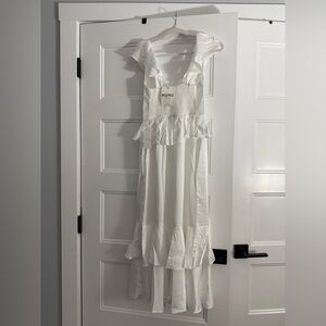 Chic white midi dress with ruffle details. Perfect for special occasions. Never worn tags still on!