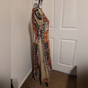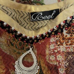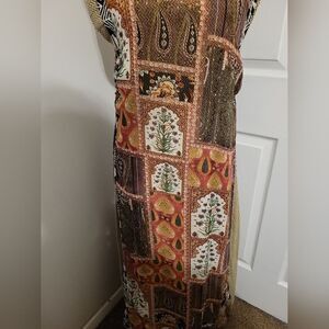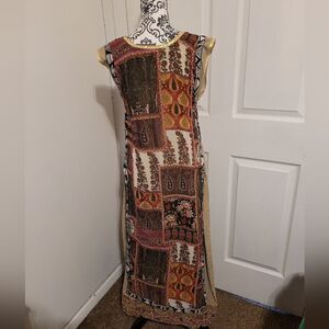 Beautiful dress with lots of color. No material. size tag says XL. Please check Measurements. measurements indicate size small.