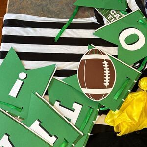 This is a referee costume/outfit and includes the jersey, the black hat, whistle, and yellow flag. I’m sending along the GO TEAM banner I made. I wore it 8 hours and washed the shirt (it was staff appreciation day at work)