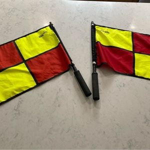 2 soccer referee shirts, size large, 1 pair soccer referee shorts, elastic waist with tie, 2 referee flags