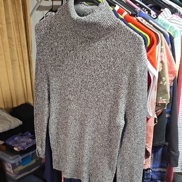 Soft marled gray turtleneck sweater with a relaxed, easy silhouette. Long sleeves and a ribbed funnel neck add warmth and a polished look. Neutral gray pairs well with everyday wardrobe staples for effortless styling.