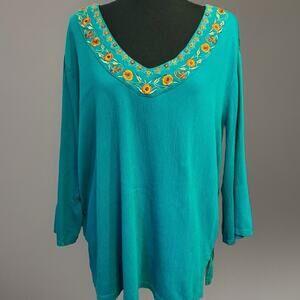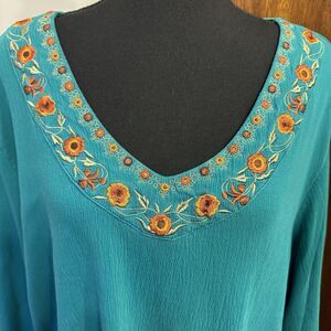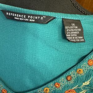 Reference Point Blouse 1X Embroidered Crinkle Top Jungle Green Cottage Core