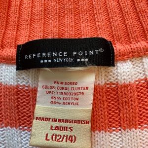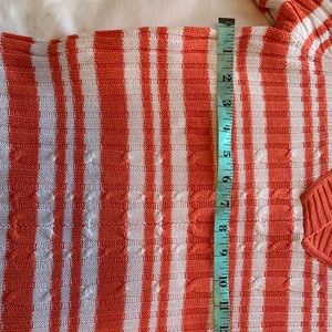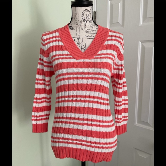 Love the coral and white color of this v neck sweater. Barely worn sweater with 3/4 length sleeves, 25 inch length, 15” across. Measurements were taken laying flat and not stretched out.