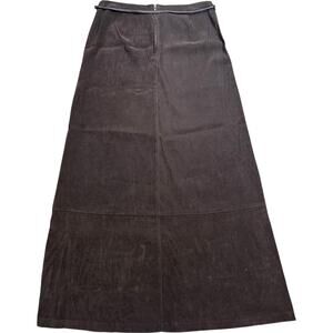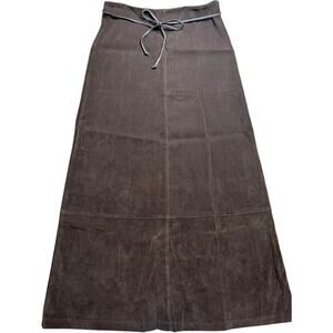 Structured brown suede-feel panel maxi skirt with tonal stitching and a slim leather cord tie at waist. Features back zip closure and soft drape with minimal seam flare. Light wear to string. Great condition.