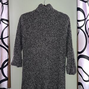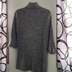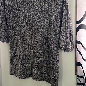 Size large, 100% acrylic, mock neck, nice, large buttons, three-quarter sleeves