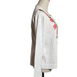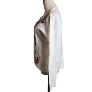 This is a super cute grandma-chic cardigan! It's white and has really pretty embroidered flowers all over the front. Plus, it's got brown velvet-y stripes going down the front too. Definitely a vibe! ✨🌸