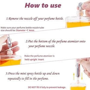 【Refillable】New and perfect design with a valve on the bottom of atomizer, it’s easy to refill, just insert the nozzle of your perfume bottle into valve at the base of atomizer. Pump up and down firmly until full, easily remove,but Do not over fill.