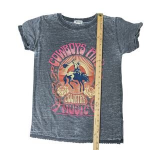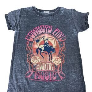 Refined Canvas “Cowboys and Country Music” tee, size S. Washed black western graphic shirt with cowboy design, rolled sleeves, and soft vintage look.