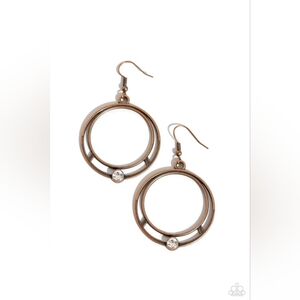 A duo of slanted copper bars interlinks two lustrous copper hoops, creating a captivating geometric frame. At the heart of this striking design, a lone white rhinestone glistens delicately, infusing the rugged aesthetic with a touch of elegance. These earrings elegantly dangle from standard fishhook fittings, marrying boldness with sophistication in every sway.