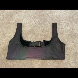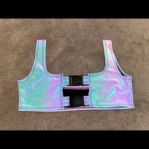 Never worn, reflective buckle crop top. Super reflective in the light, material does have a slight stretch. Fits on the smaller side than listed on top, fits more like a medium than a large. Perfect top for your next rave outfit!
