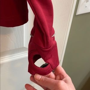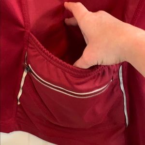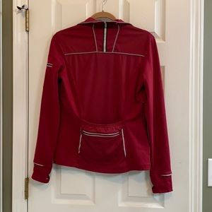 Zippered jacket. Zip pockets. 2 in front, 1 on sleeve, 1 in back. Also a back pouch. Thumb hole on sleeves. Reflective accents.