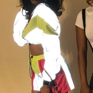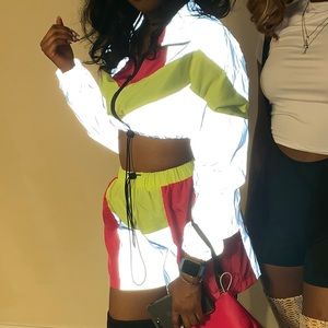 Cute reflective crop top windbreaker style jacket with matching reflective shorts, has adjustable straps to make it as tight or loose as you want, worn once for prom after party.