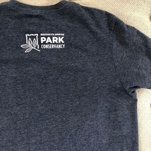 Custom Ink dark blue heather graphic T-shirt with “reforestation“ and “onetreeplanted.org” on the front and “Brooklyn Bridge Park Conservancy“ on the back. Gently preowned and perfectly broken in. The size tag has been removed but this T-shirt measures 25” from shoulder to hem and 19” from armpit to armpit, Placing it at roughly unisex size S or women’s size M