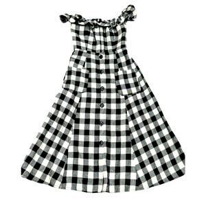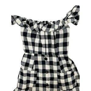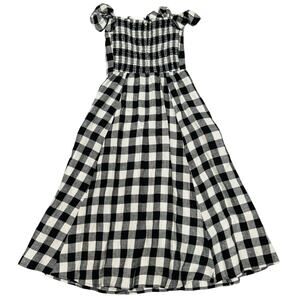 Embrace casual elegance with the Reformation Black and White Sundress, featuring a smocked bodice and off-the-shoulder neckline. This sleeveless dress showcases a classic black and white color palette, perfect for a relaxed day out. The flutter sleeves add a touch of whimsy, while the sundress style ensures comfort and style. Ideal for casual occasions, this dress combines timeless charm with modern flair.