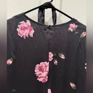 100% silk, black with a purple and pink floral print, surplice neckline, faux wrap, long puff sleeves, midi to maxi length depending on height, zippered back, unlined. Comes with a belt tie that is not attached—no belt loops. Can wear with or without.