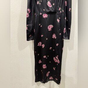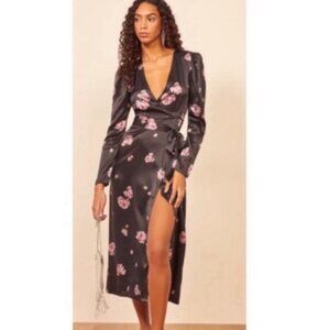 Reformation 100% Silk Toronto Black Pink Purple Floral Faux Wrap Midi Dress
