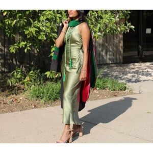 Step out in style with this elegant green satin dress. Perfect for any occasion, its sleek design and luxurious fabric make it a must-have. Pair it with your favorite accessories for a complete look.