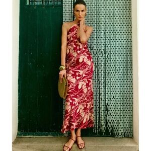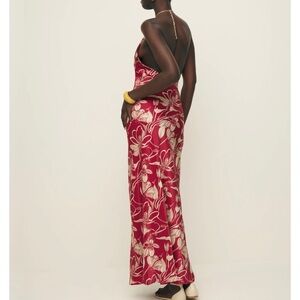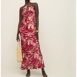 Reformation, a sleeveless maxi-length dress with a halter neckline and cutout at the bust.