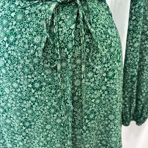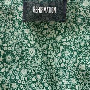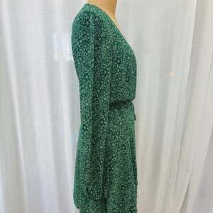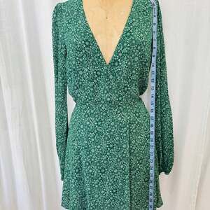 This charming Reformation mini dress features a vibrant green base with a delicate floral pattern, perfect for a spring day out or a casual gathering. The long-sleeved wrap style offers a flattering silhouette and an adjustable fit. Made from 100% viscose, this dress is comfortable and lightweight. Made in the USA.