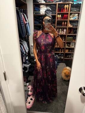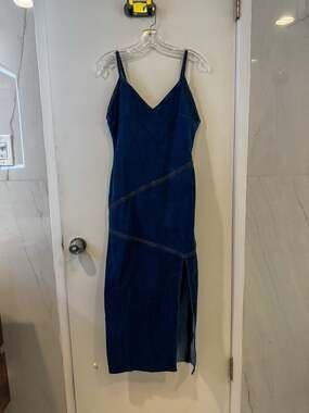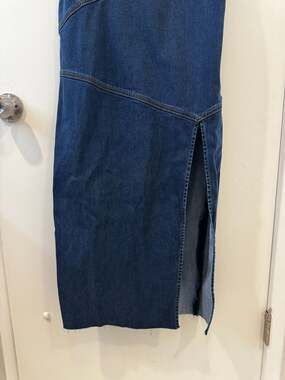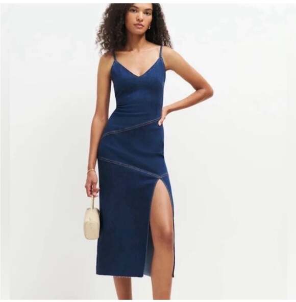 Keywords: Reformation Jeans, denim dress, maxi dress, front slit, sustainable fashion, dark wash, boho chic, summer staple.