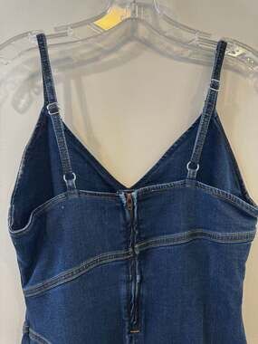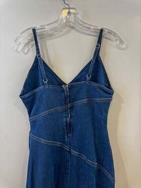Reformation Jeans Denim Maxi Dress, Size 4 — Sustainable dark wash denim with a front slit. This stylish dress features adjustable spaghetti straps, a V-neckline, and unique diagonal seam detailing for a flattering silhouette. Constructed from high-quality denim with a convenient back zipper closure and a raw-edge hem.