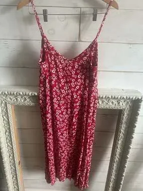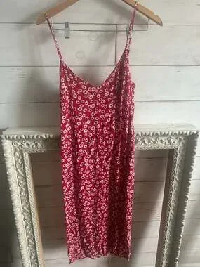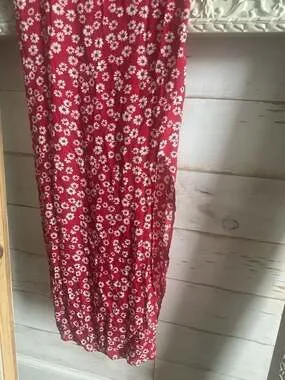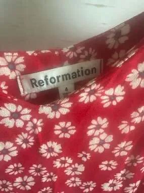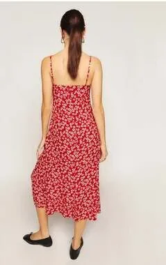 Reformation Red Floral Midi Dress, Size 4. Featuring a classic red base with a delicate white daisy print, this breezy midi dress is perfect for summer events or casual outings.