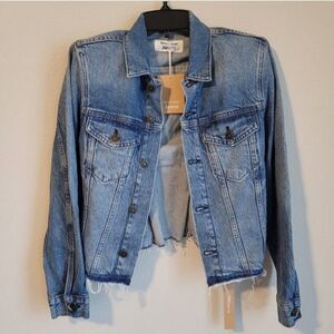 Cool guy jacket. This is a hip length rigid denim jacket with center front buttons, front pockets, and slightly padded shoulders.