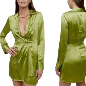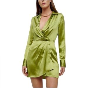 May cause compliments. The Alaine is a long sleeve, mini length dress with a collared neckline. It features non- adjustable center front buttons and a faux wrap skirt. It's fitted in the waist to show off your figure. The Alaine Silk Dress pairs well with the Remy Knee Boot - Button front - Collared - Faux wrap skirt - Fitted in waist - Long sleeve - Mini length - Ruching detail