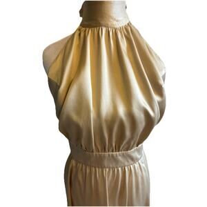 Done getting married in this dress on the beach.. or anywhere! This is a classic Hollywood glam dress! The Reformation Alani Silk Maxi Dress in Champagne is a stunning and elegant gown perfect for various occasions including weddings, proms, and formal events. This dress features a beautiful solid ivory color with pleated accents and a stylish bow detail, giving off a Greek goddess vibe. Made from luxurious silk material, this sleeveless dress with a halter neckline and zip closure is designed for the modern woman who wants to look sexy and stylish. The dress is in size 16 and has a long length, ideal for the summer season. Perfect for those who love a bohemian and 80s-inspired look.