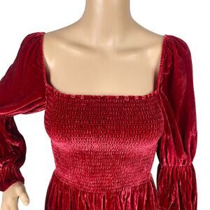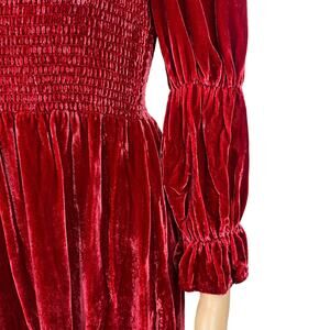 This dress from Reformation is so cute! It is a pull on style with smocked elastic top, 3/4 Juliet style sleeves with smocked detail. Fabric is a super soft crushed velvet in the color crimson red. Dress is a short mini style. Excellent condition, no flaws to note!