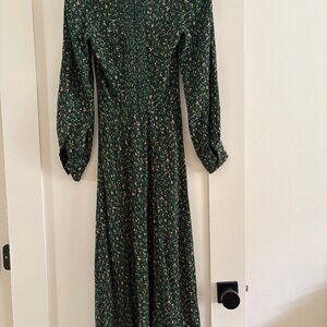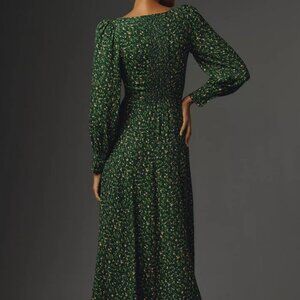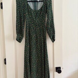 Elegant midi dress with a sultry square neckline, subtle puff shoulders, and side slit. Fitted bodice with back zip closure and buttoned wrists. Flowy skirt with a modern, feminine silhouette in green floral.