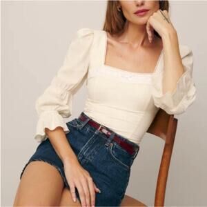 Top notch. Shop the Amalie Top from Reformation, a fitted long sleeve top with lace trim, a center front bow at the neckline, and puff sleeves.