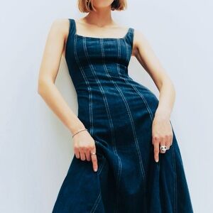 This elegant blue denim dress offers a perfect blend of style and comfort. Ideal for any occasion, it features a flattering fit and a timeless design.