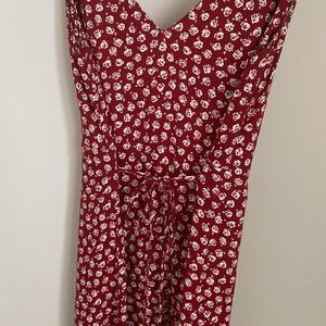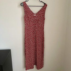 Great pre-loved Ares midi dress by Reformation. Kedzie color is white floral pattern on red background. Features a v-neckline in the front and back, and a tie to cinch the waist. Dry cleaned and ready for a new home!