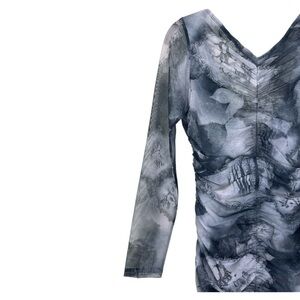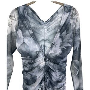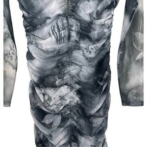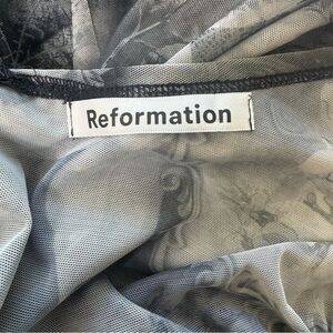reformation ash mesh midi dress, reformation bodycon dress small, ruched long sleeve cocktail dress, grey mesh midi dress, sustainable evening dress, garden print reformation dress, eco friendly fashion, reformation party dress