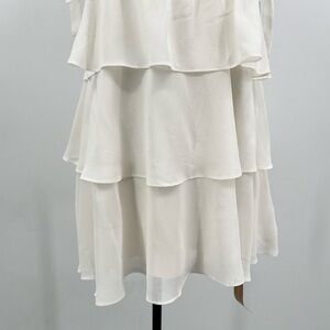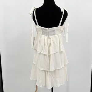 Reformation's Avni babydoll minidress features a square neck, tie straps, and a tiered skirt.The ruched style is complete with a fitted bust and a relaxed skirt.