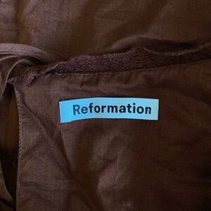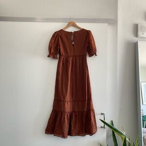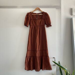 “Reformation's 'Bekkah' dress is cut from organically grown cotton and traced with delicate crocheted lace. It has a tiered hem, prairie-style puffed sleeves and an elegant square neckline. The warm 'Cinnamon' hue will work so well with dainty gold jewelry and a soft pink lip.“