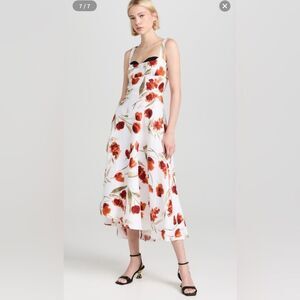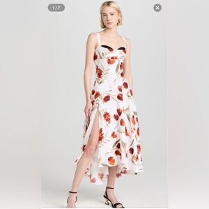 Elegant white dress with vibrant red floral patterns. Perfect for any occasion.